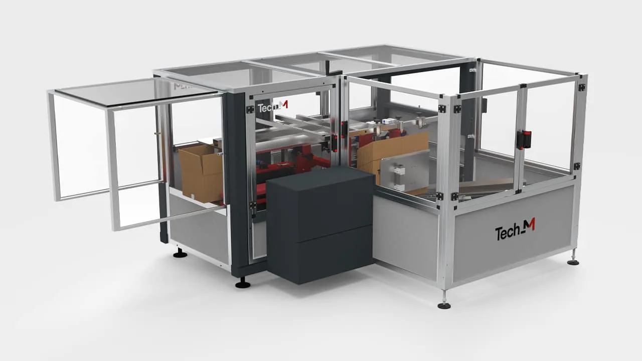 The BEM 200xs automatic case erector is designed for handling small-format RSC-type boxes, ensuring high precision and productivity in production lines. This equipment includes a folded box magazine, a system to open them, close the bottom flaps, and seal the bottom, delivering boxes ready to be filled vertically. Its operation is intuitive thanks to an LCD touch screen that simplifies adjustment and handling.