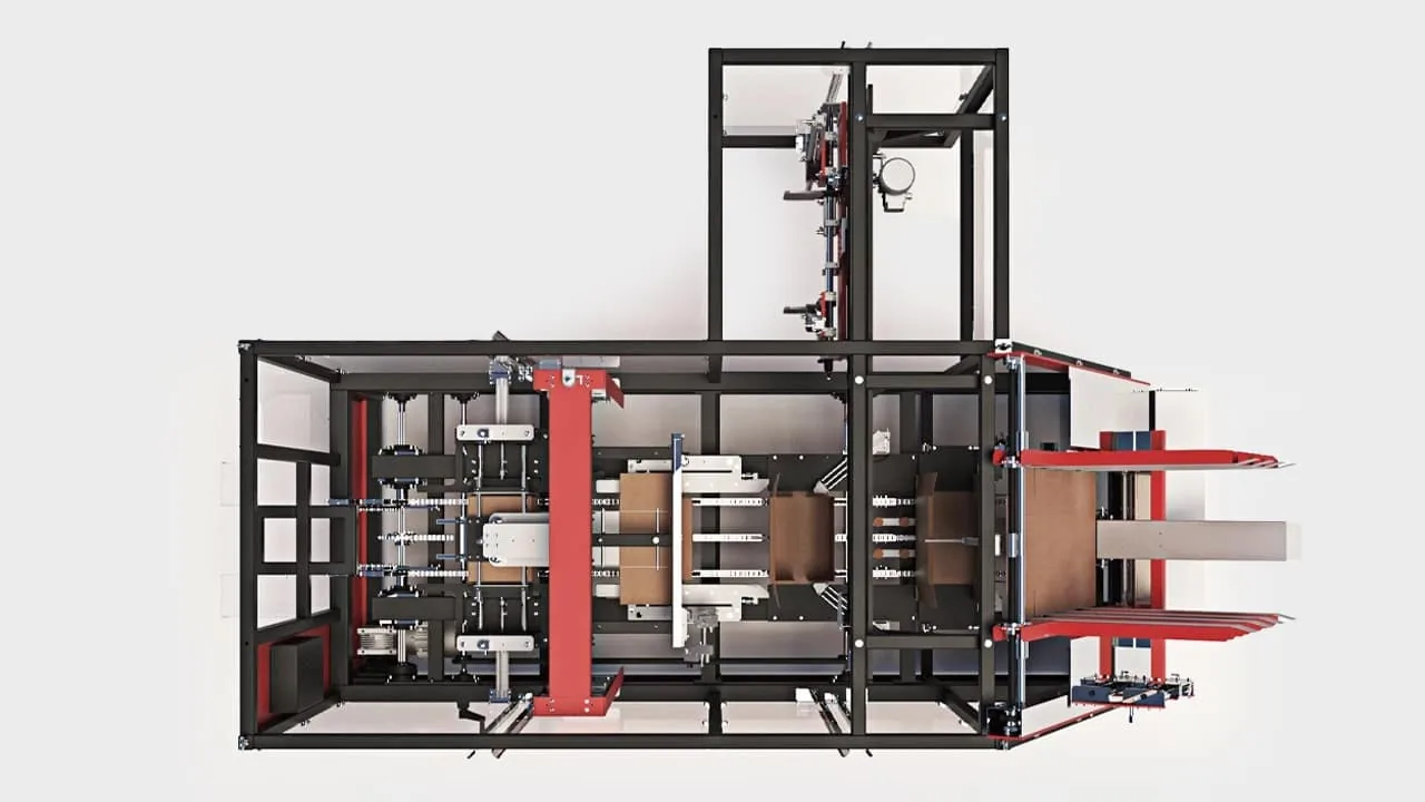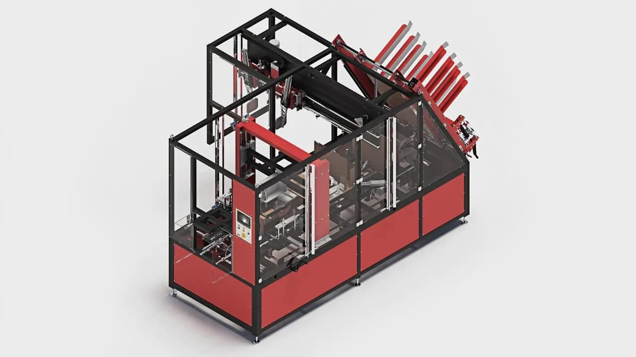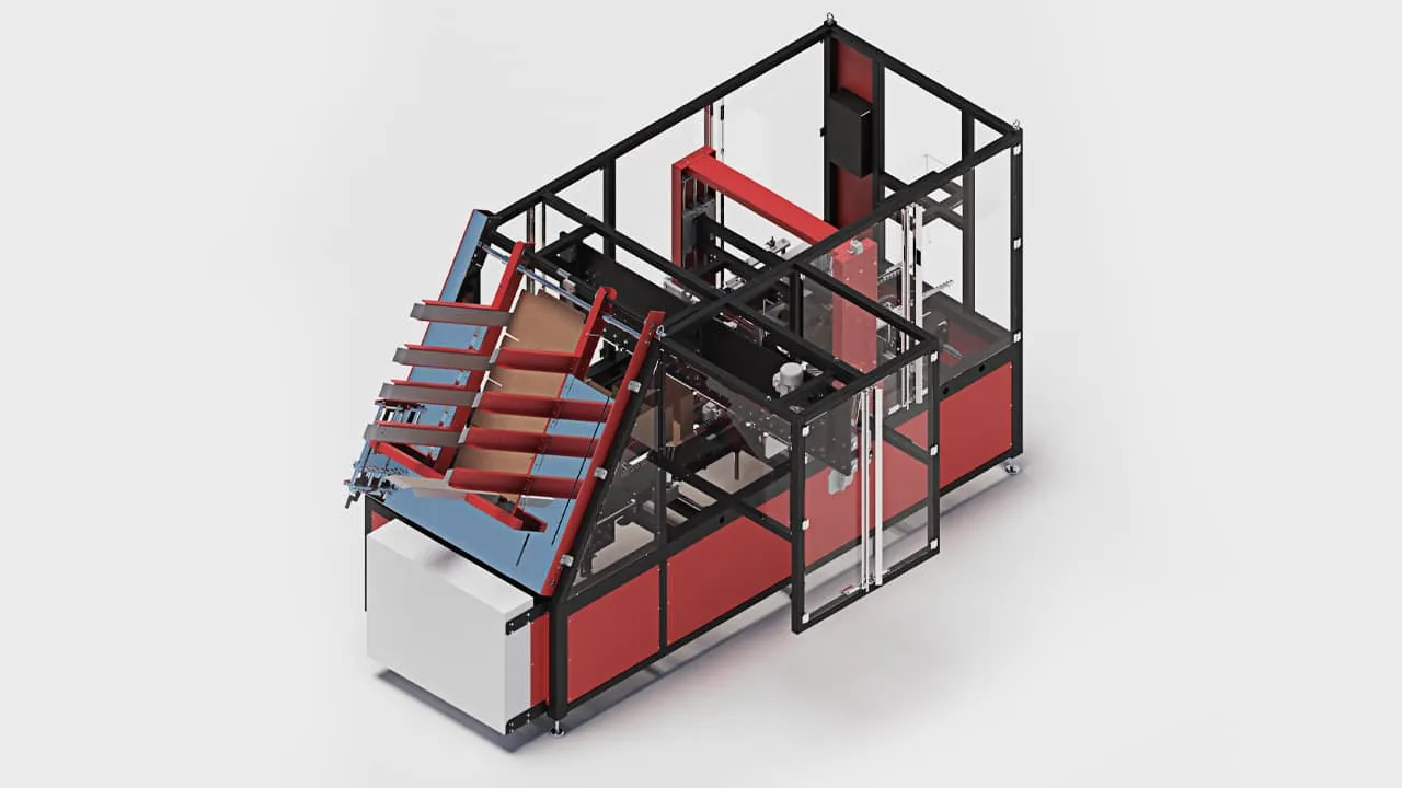The SWING wrap-around case packer is a compact and efficient solution designed for production lines requiring adaptability and precision in product packing. It uses die-cut cardboard sheets applied around the product and sealed with hot glue, ensuring secure and durable packaging. It is suitable for a wide variety of rigid or semi-rigid products, with customized introduction systems tailored to the client's needs.
