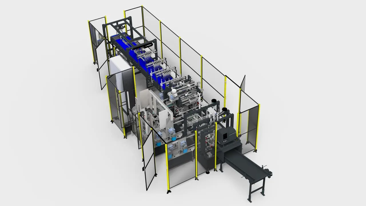 The SWING 250 wrap-around case packer is a compact and efficient solution designed for production lines requiring adaptability and precision in product packing. It uses die-cut cardboard sheets applied around the product and sealed with hot glue, ensuring secure and durable packaging. It is suitable for a wide variety of rigid or semi-rigid products, with customized introduction systems tailored to the client's needs.